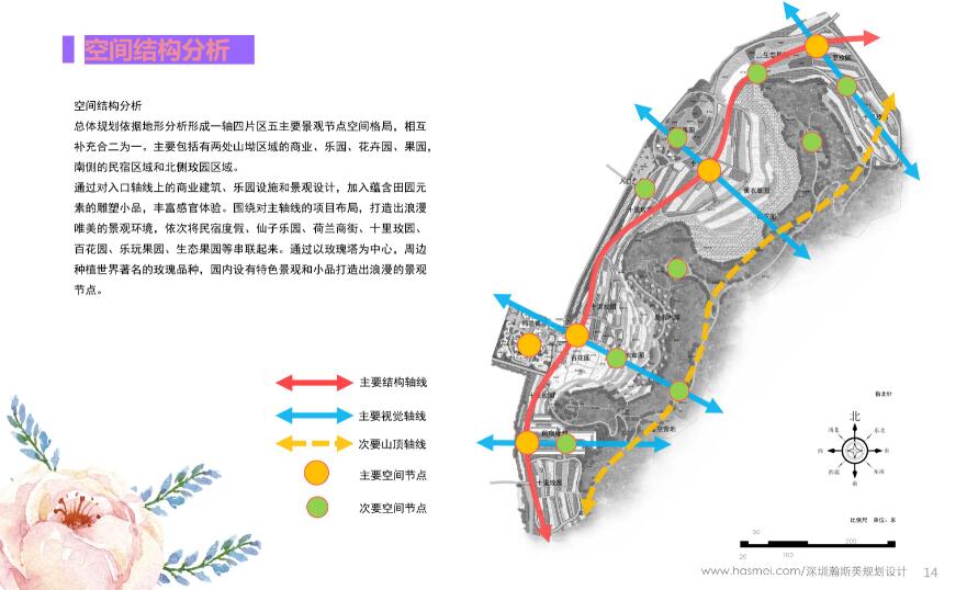 總體規(guī)劃依據(jù)地形分析形成一軸四片區(qū)五主要景觀節(jié)點(diǎn)空間格局,相互補(bǔ)充合二為一。主要包括有兩處山坳區(qū)域的商業(yè)、樂(lè)園、花卉園、果園,南側(cè)的民宿區(qū)域和北側(cè)玫園區(qū)域。
